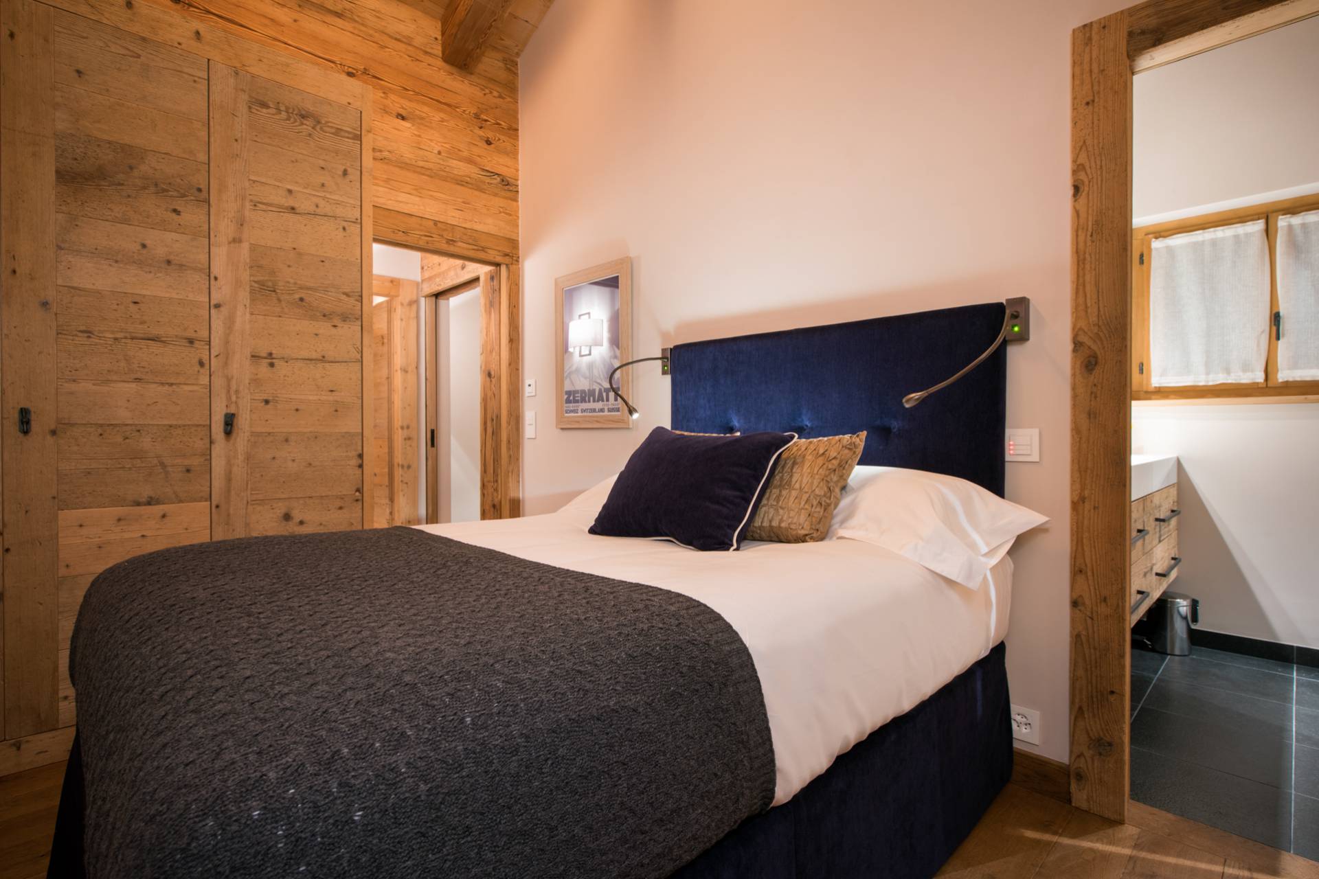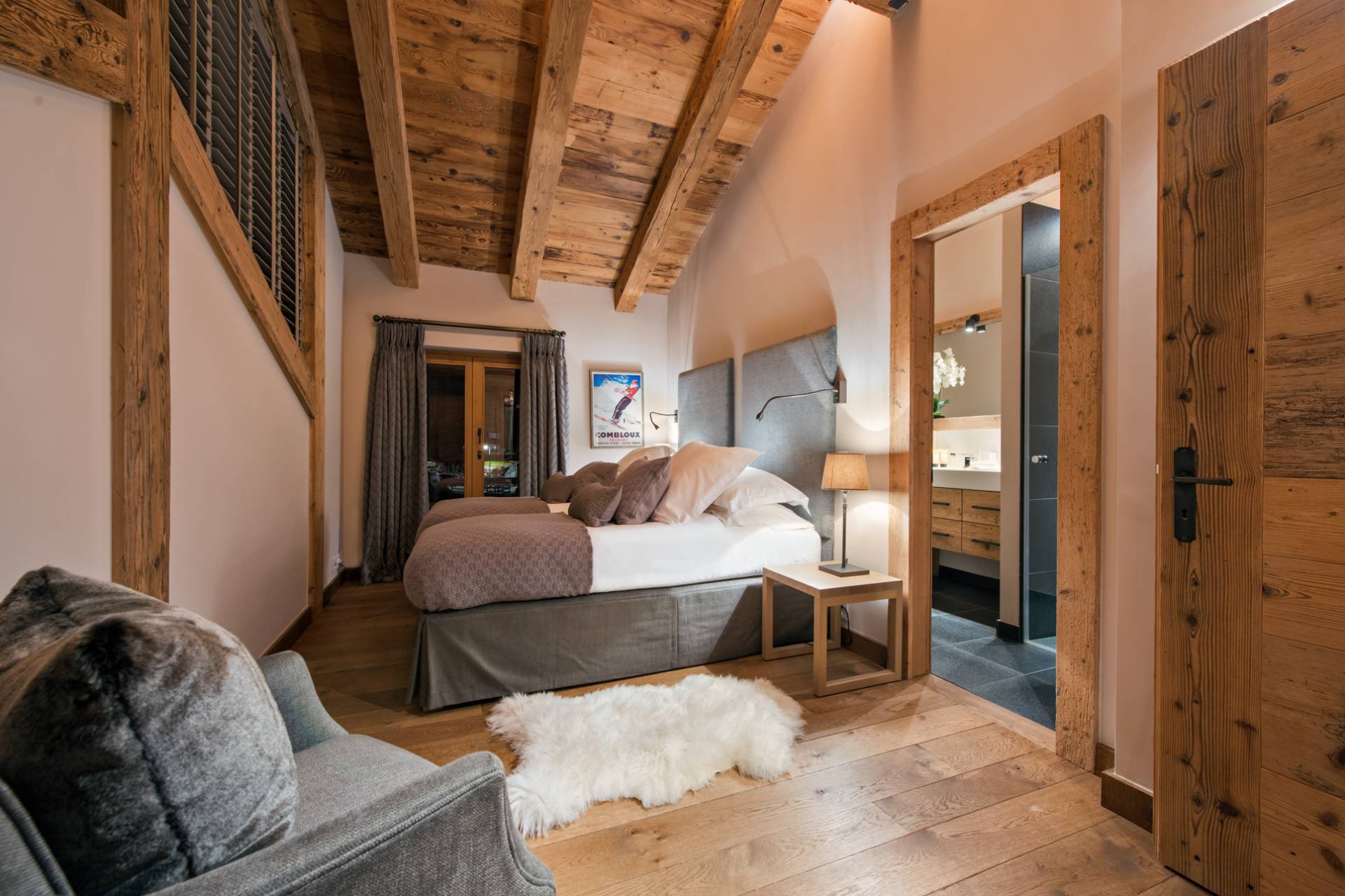 Au dernier étage, vous trouverez deux autres chambres, dont l’une avec lit double et l’autre modulable avec lit double ou lits jumeaux, qui ont chacune accès à un balcon privé. Le bois a la part belle dans l’aménagement intérieur des chambres avec lambris au plafond et parquet, mais aussi des salles de bain, où il voisine avec l’ardoise dans un contraste des plus raffinés. Les affiches publicitaires anciennes de voyage apportent une touche vintage à ce décor de caractère.