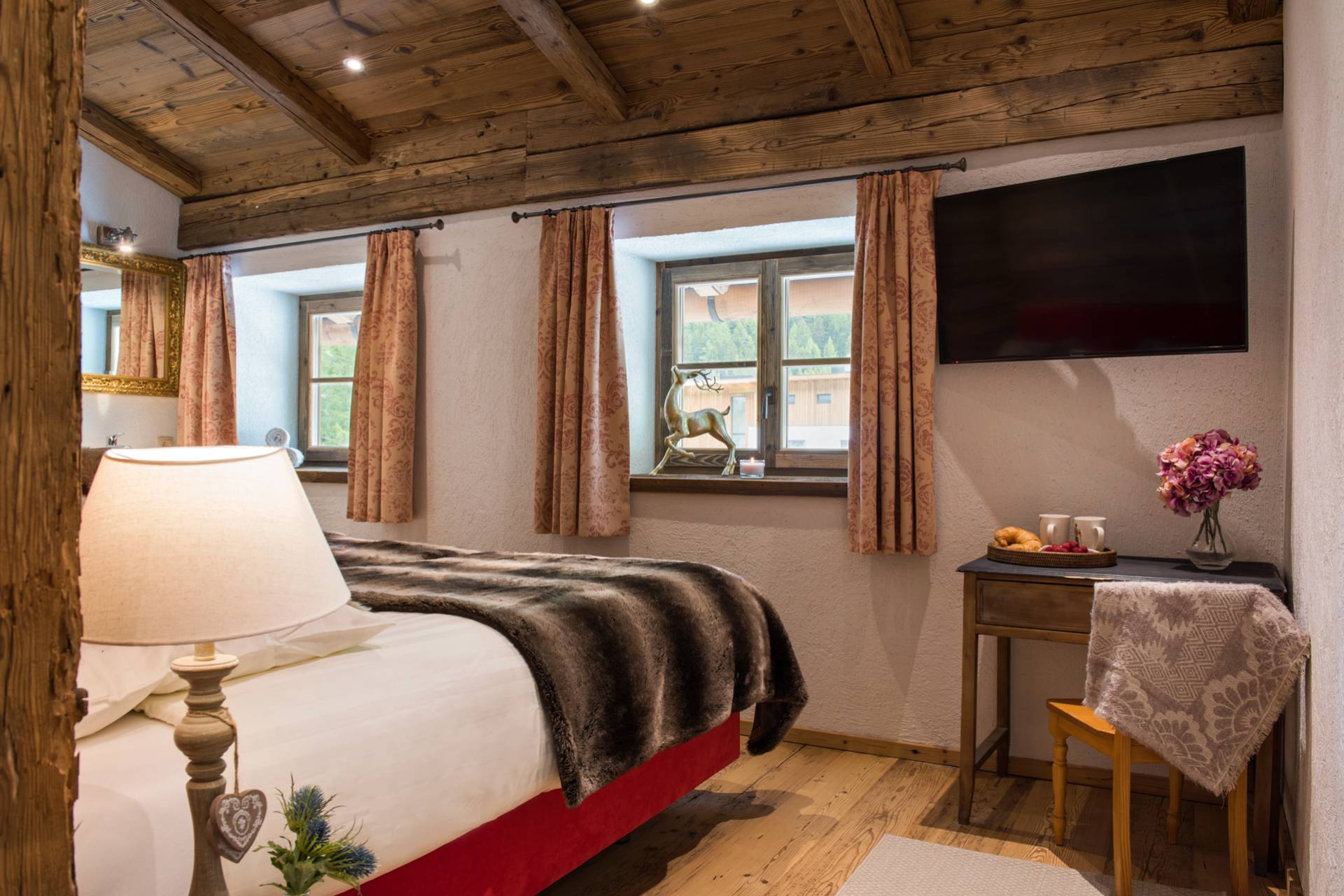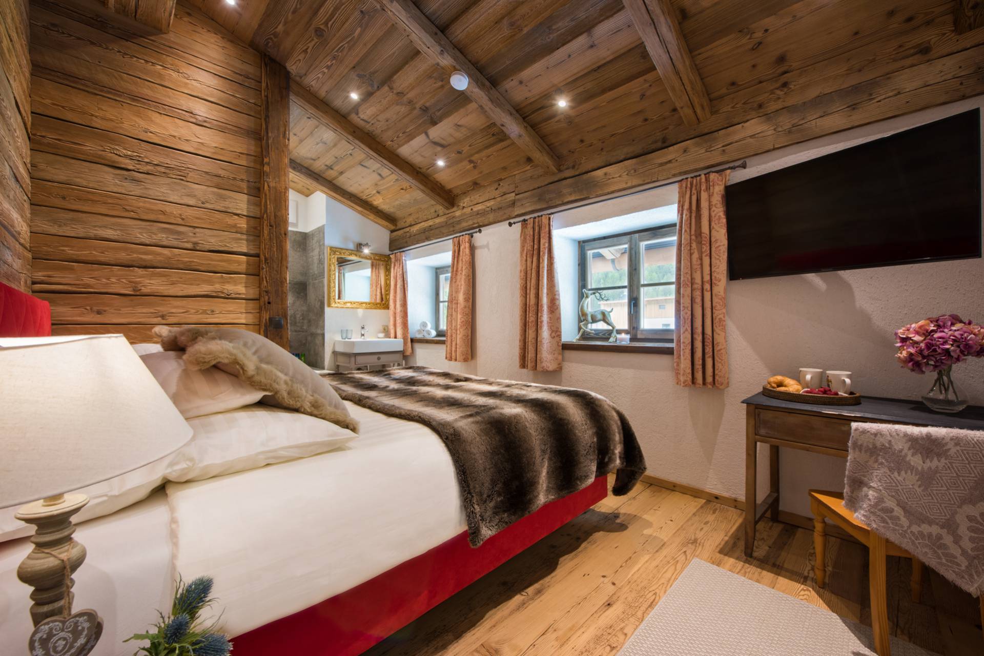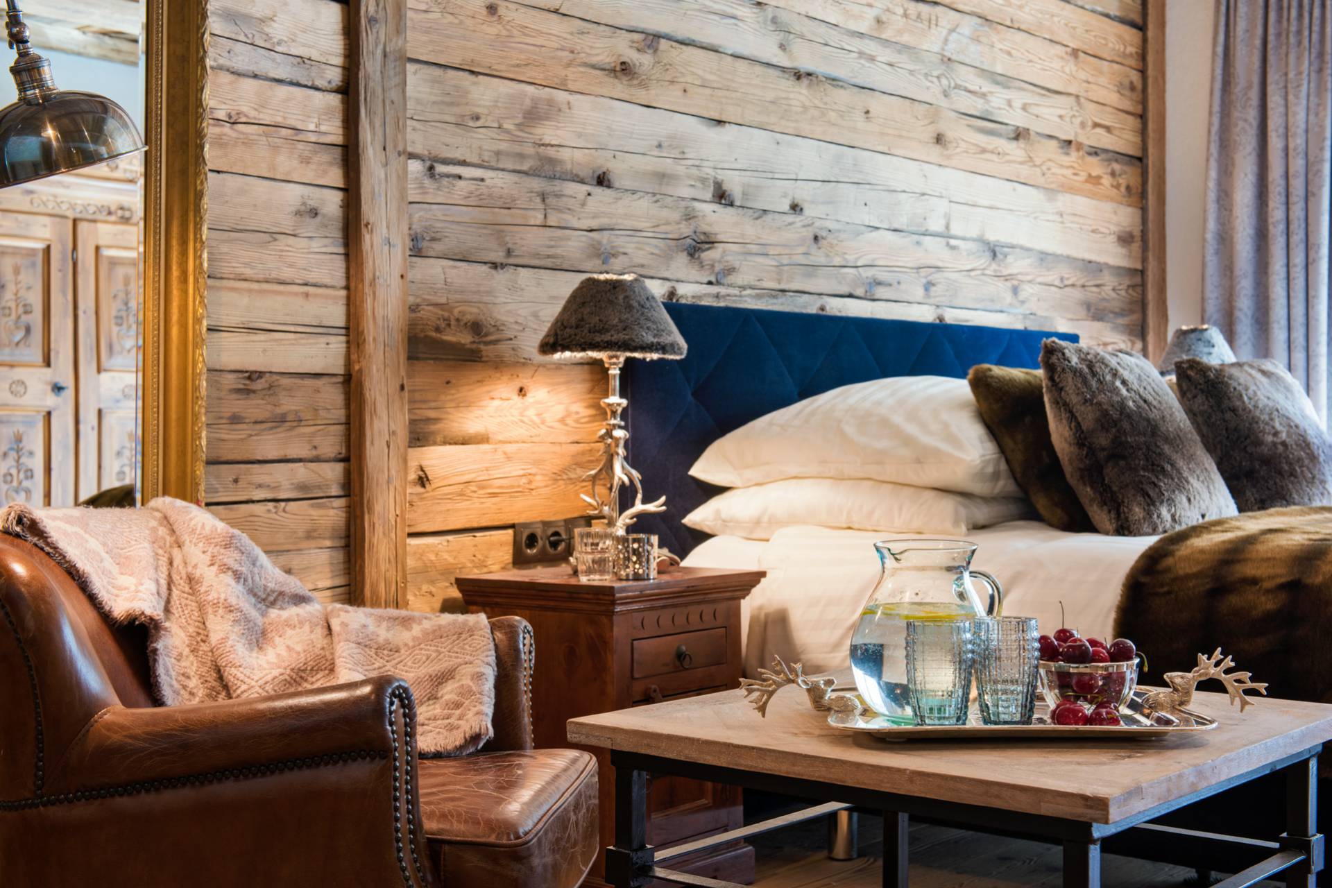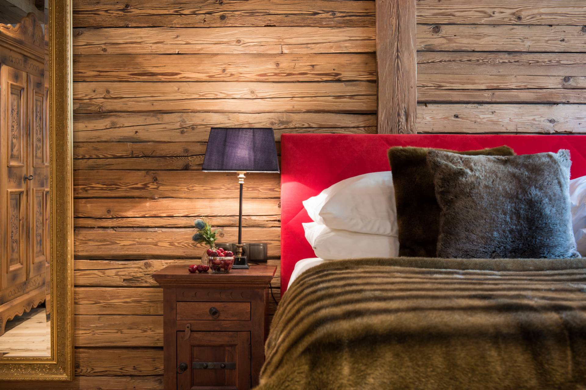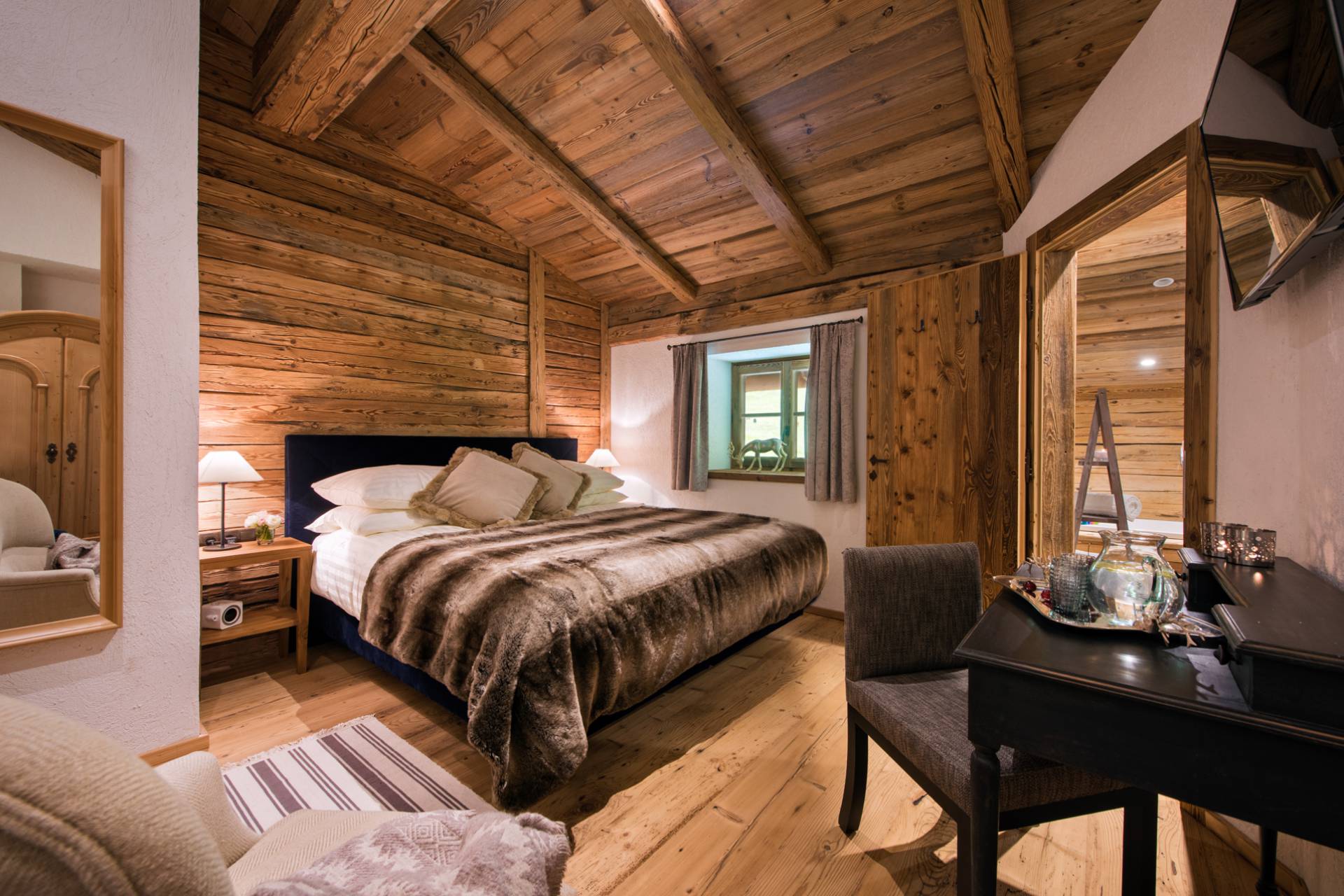 Alliant tradition et modernité, les superbes miroirs accrochés aux murs des trois autres chambres de l’étage inférieur s’accordent à merveille avec les boiseries des lieux. Les deux chambres doubles, aux couvre-lits et coussins en peau, disposent d’une télévision et d’une salle de bain attenante. Une troisième chambre pourvue de lits superposés est consacrée aux enfants.