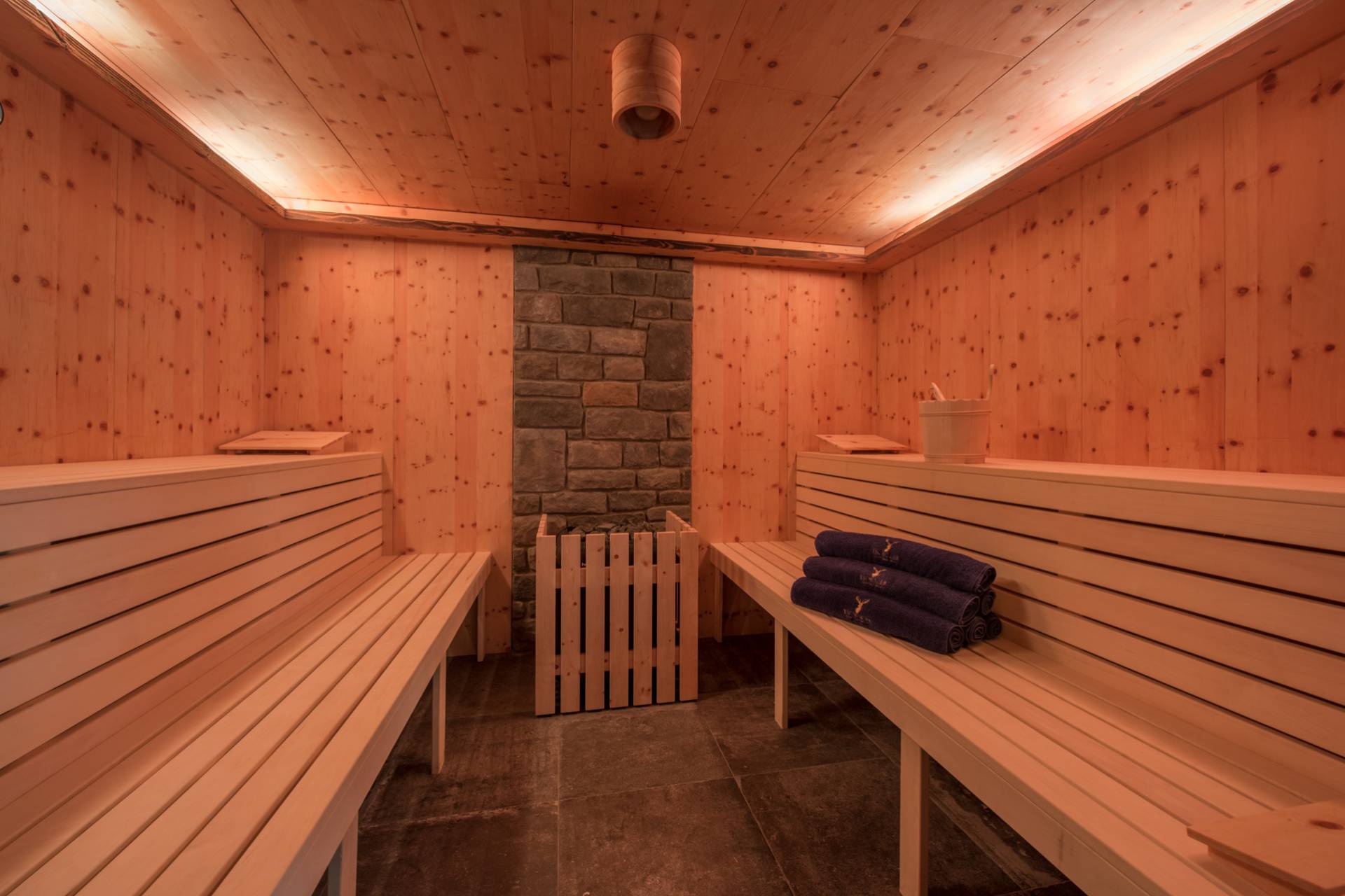 Toute équipée, la cuisine s’ouvre sur la pièce de vie commune. Vous pourrez y préparer vos repas, puis les partager autour d’une grande tablée dans le chaleureux coin salle à manger. Près de la cheminée, un magnifique salon décoré de canapés en velours vous attend pour de délicieux moments de tranquillité au coin du feu. Au même étage, vous pourrez vous reposer dans le coin détente aménagé à cet effet ou apprécier la salle de cinéma. Après de longues journées de ski, certains préfèreront peut-être se délasser dans le sauna tandis que les férus de sport pourront s’exercer dans la salle de gym mise à leur disposition.