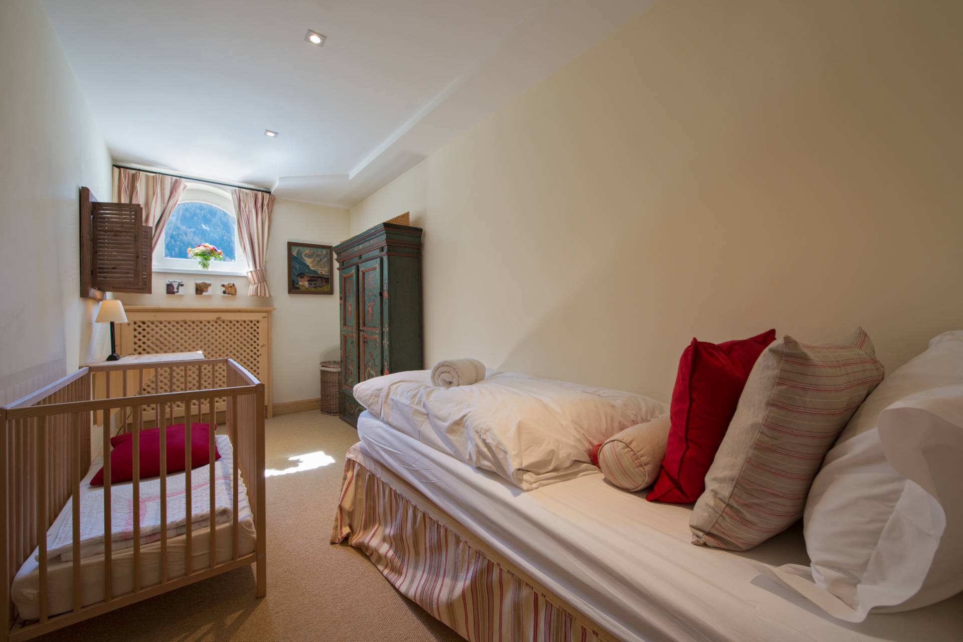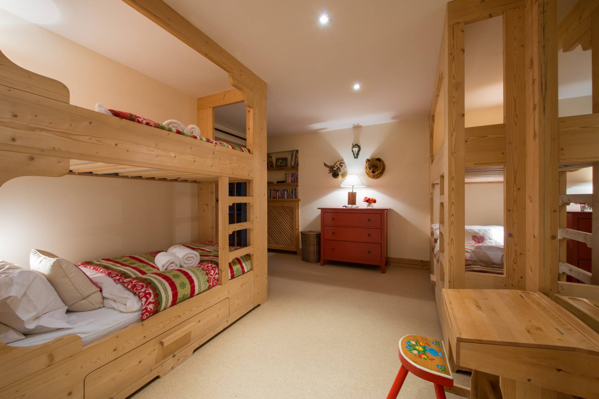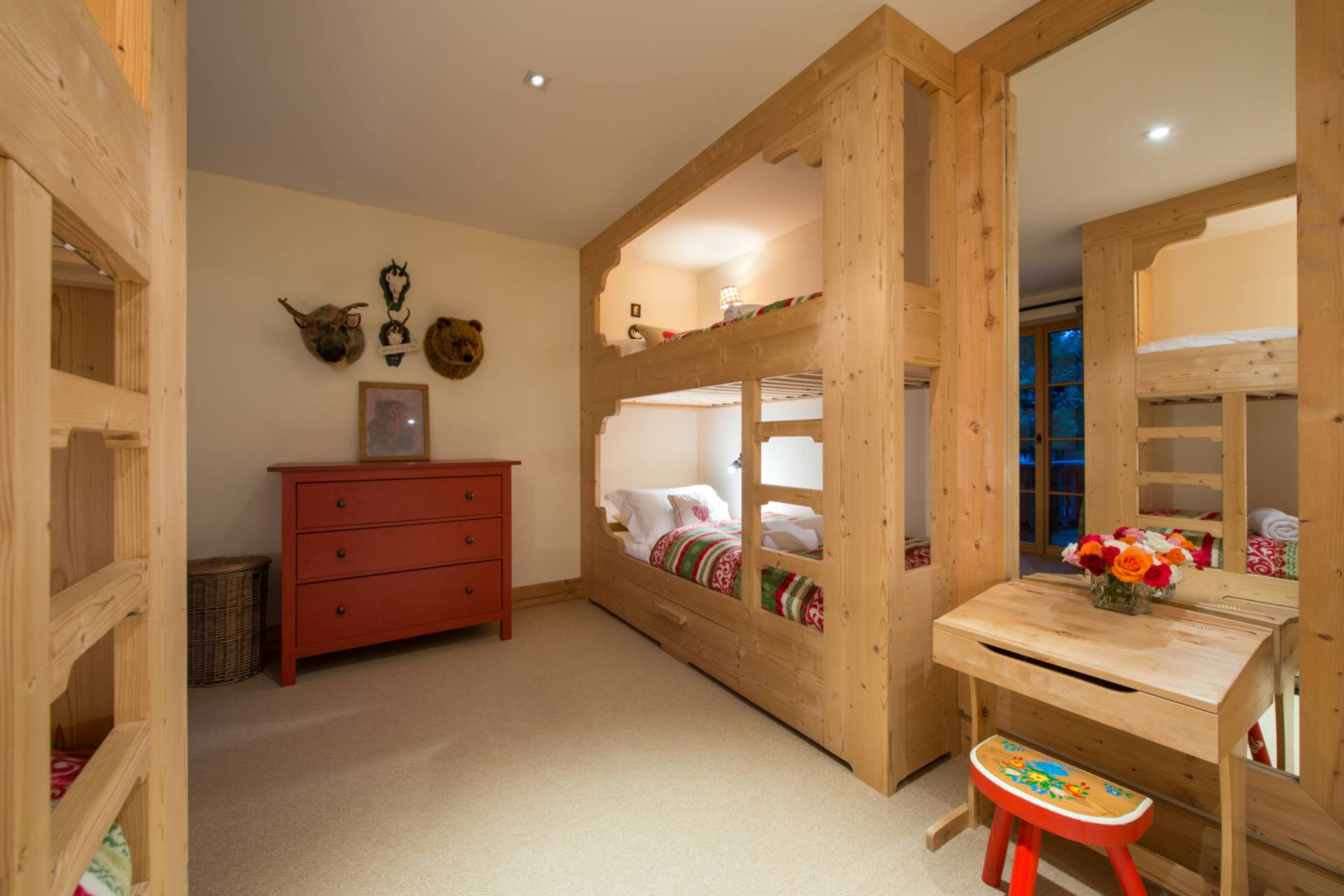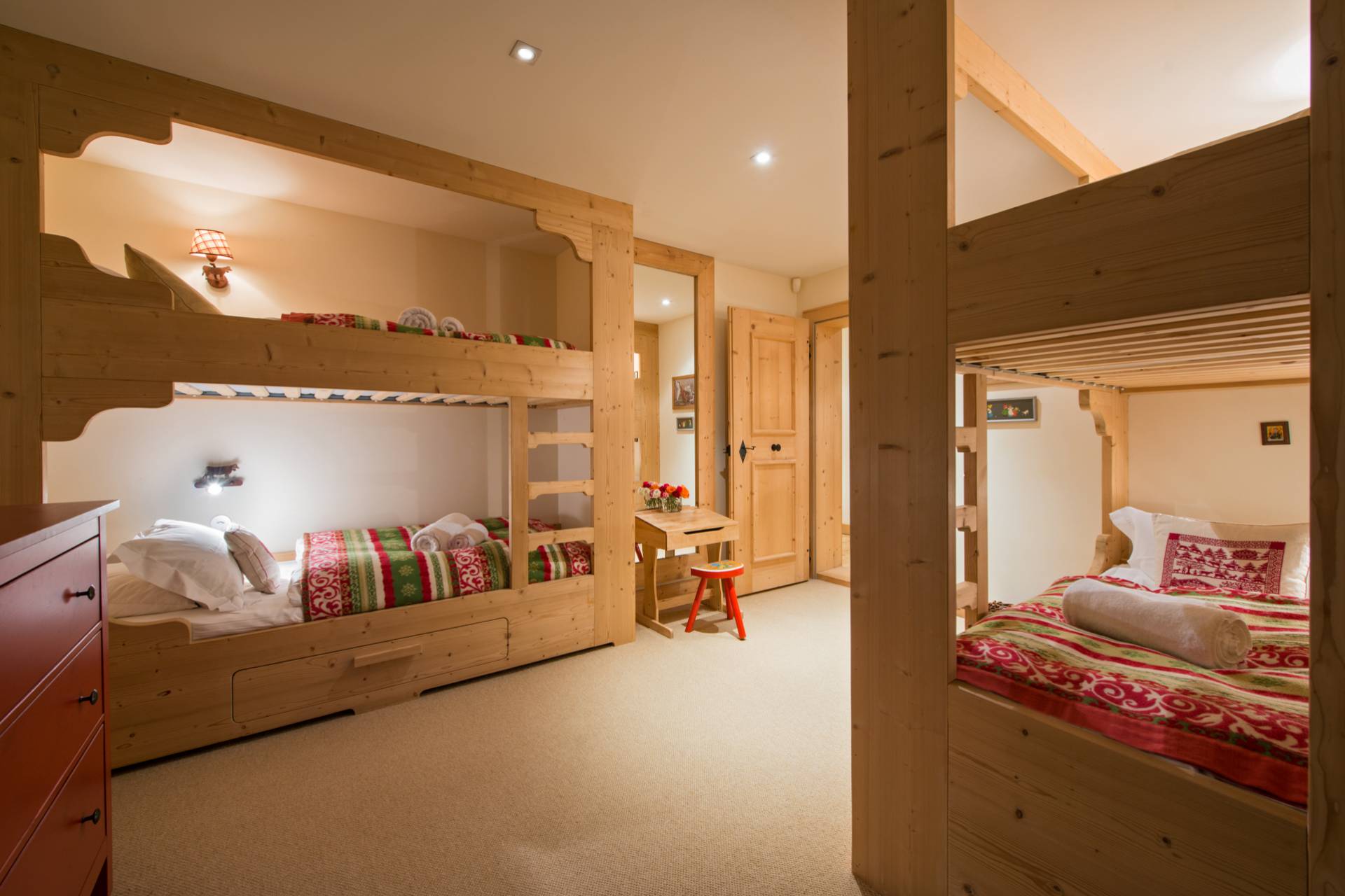Quatre autres chambres se répartissent l’espace du premier étage. Toutes les chambres doubles sont modulables grâce à leurs lits jumeaux. Une charmante chambre d’enfants est pourvue de quatre lits superposés en bois, non loin du coin bureau et d’un espace bibliothèque. Chaque chambre a ses couleurs et ses tons. Elles sont agrémentées de magnifiques armoires en bois précieux aux décorations traditionnelles tyroliennes. L’une des deux chambres doubles dispose d’un poêle traditionnel habilement décoré quand une autre est pourvue d’une salle de bain avec baignoire et douche donnant directement sur le balcon et sur la superbe vue montagneuse.