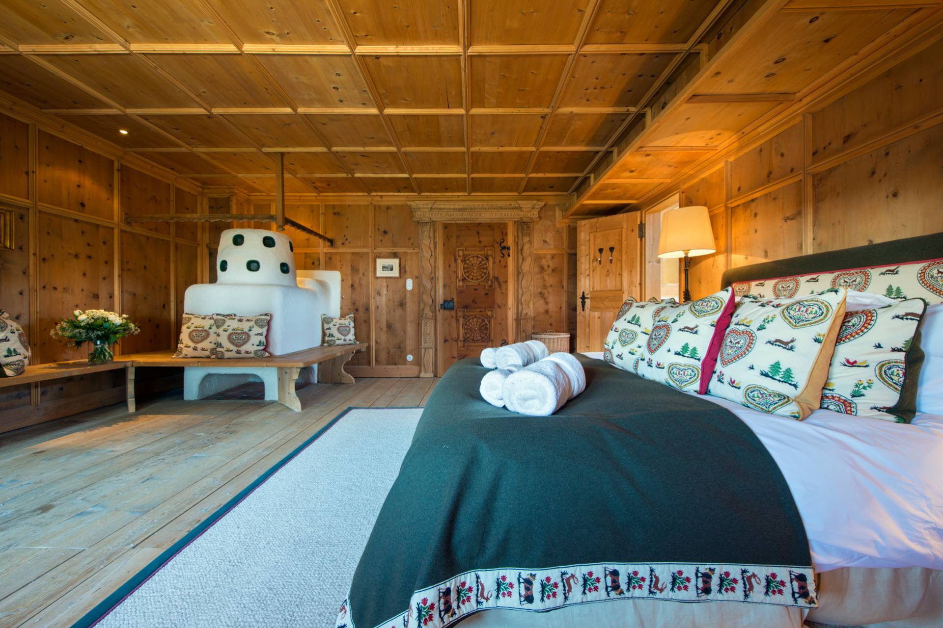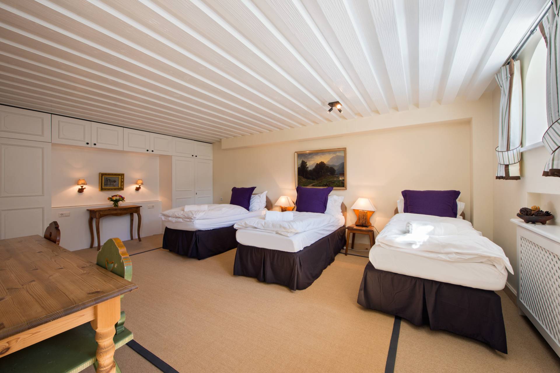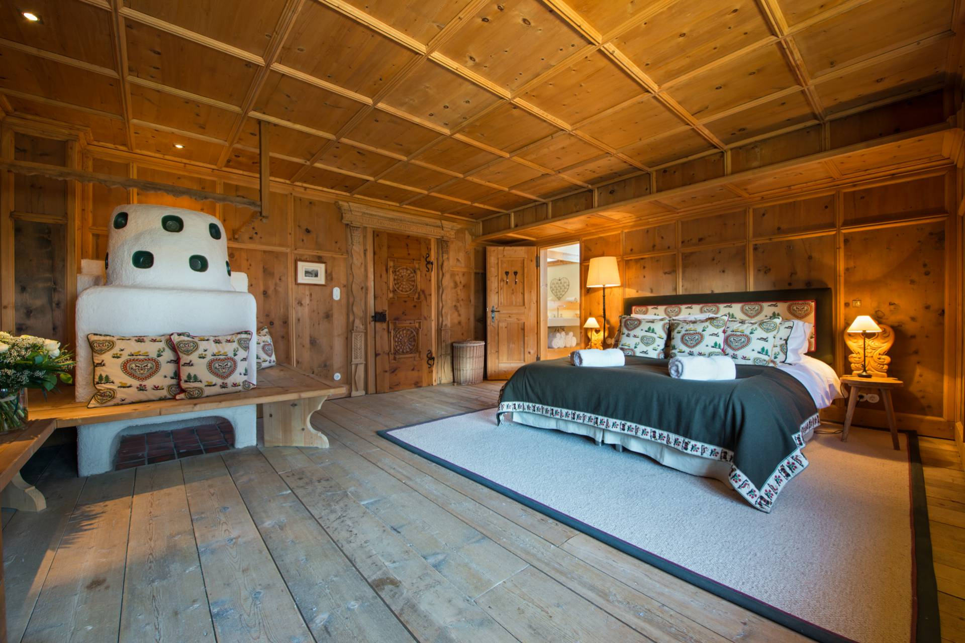 Quatre autres chambres se répartissent l’espace du premier étage. Toutes les chambres doubles sont modulables grâce à leurs lits jumeaux. Une charmante chambre d’enfants est pourvue de quatre lits superposés en bois, non loin du coin bureau et d’un espace bibliothèque. Chaque chambre a ses couleurs et ses tons. Elles sont agrémentées de magnifiques armoires en bois précieux aux décorations traditionnelles tyroliennes. L’une des deux chambres doubles dispose d’un poêle traditionnel habilement décoré quand une autre est pourvue d’une salle de bain avec baignoire et douche donnant directement sur le balcon et sur la superbe vue montagneuse.