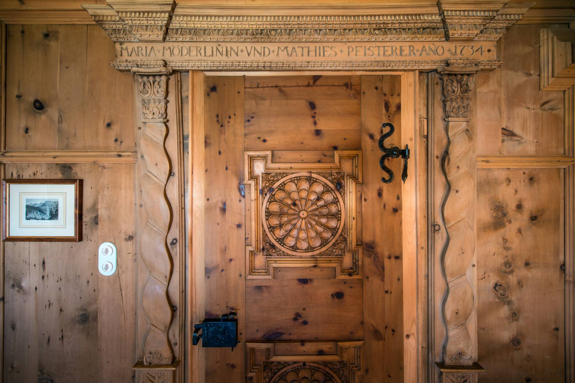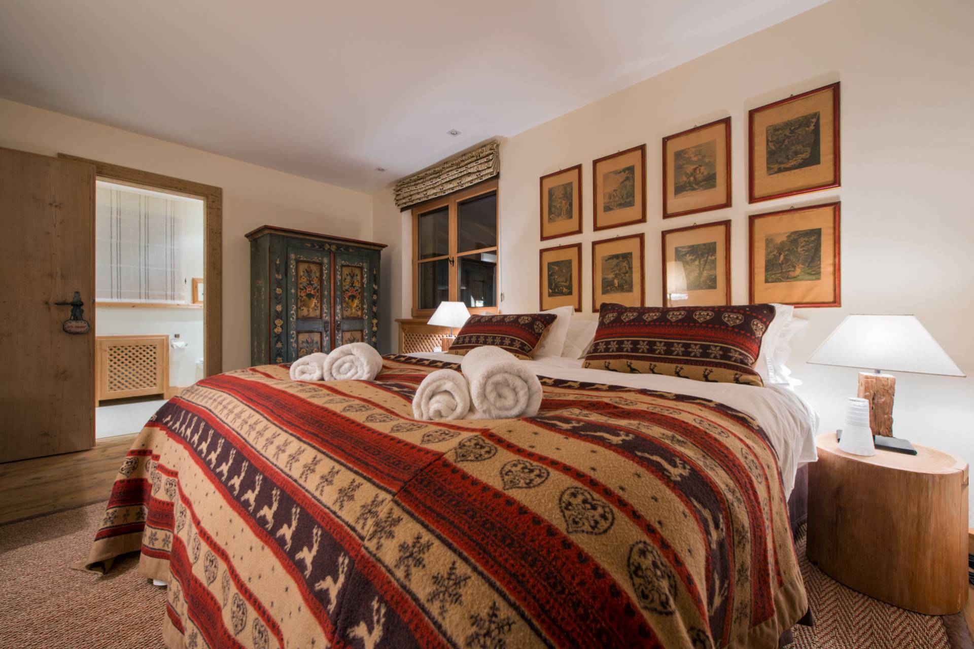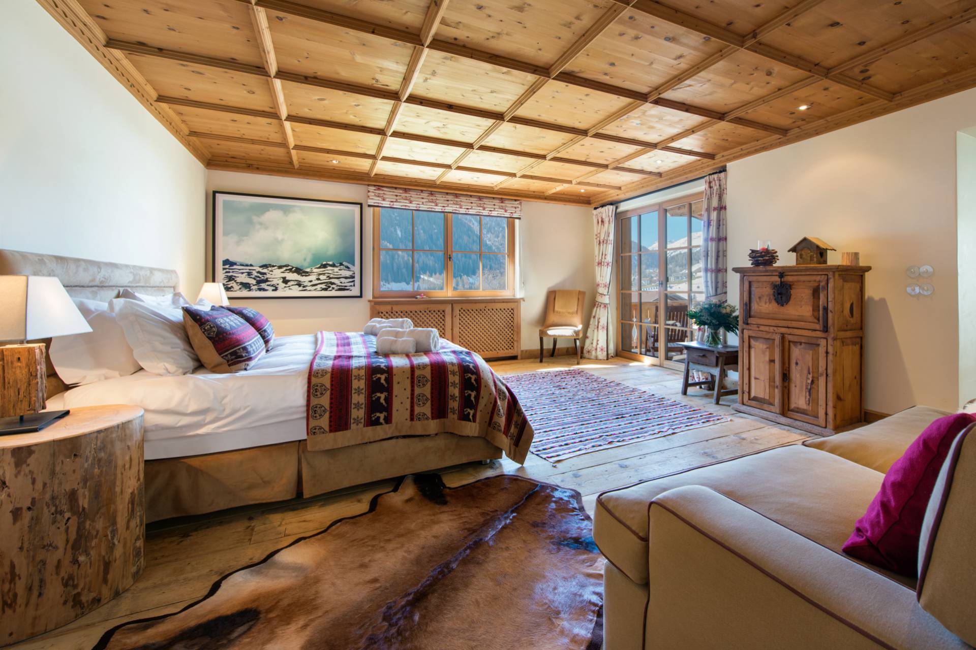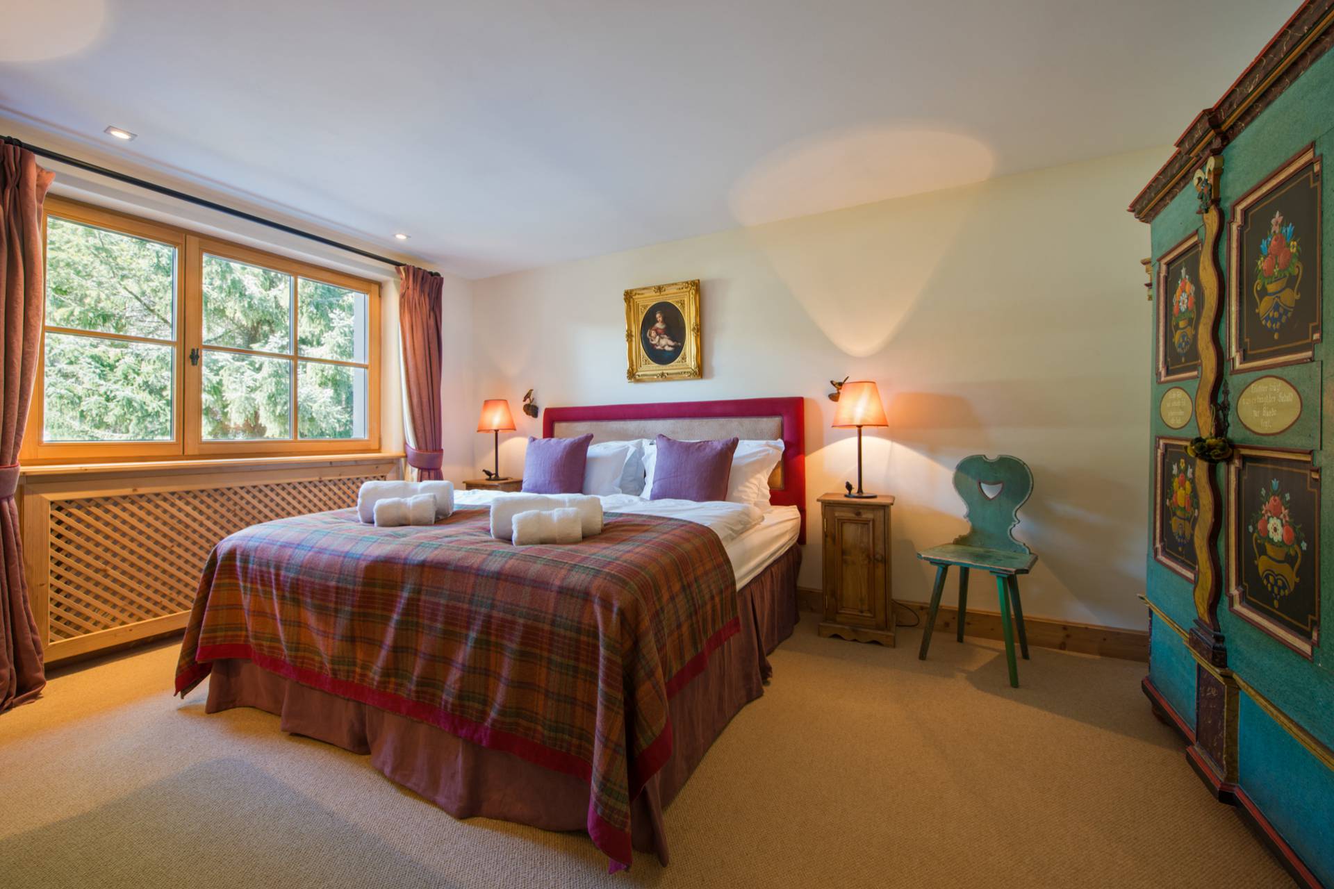 Quatre autres chambres se répartissent l’espace du premier étage. Toutes les chambres doubles sont modulables grâce à leurs lits jumeaux. Une charmante chambre d’enfants est pourvue de quatre lits superposés en bois, non loin du coin bureau et d’un espace bibliothèque. Chaque chambre a ses couleurs et ses tons. Elles sont agrémentées de magnifiques armoires en bois précieux aux décorations traditionnelles tyroliennes. L’une des deux chambres doubles dispose d’un poêle traditionnel habilement décoré quand une autre est pourvue d’une salle de bain avec baignoire et douche donnant directement sur le balcon et sur la superbe vue montagneuse.