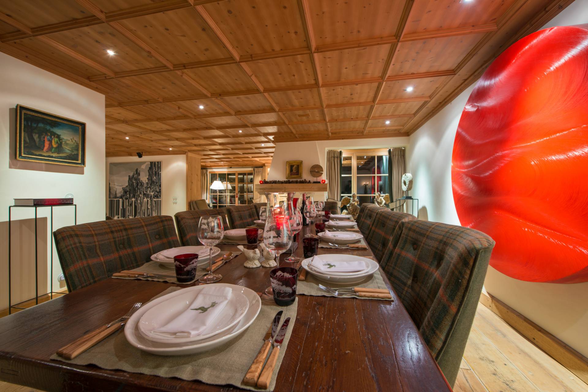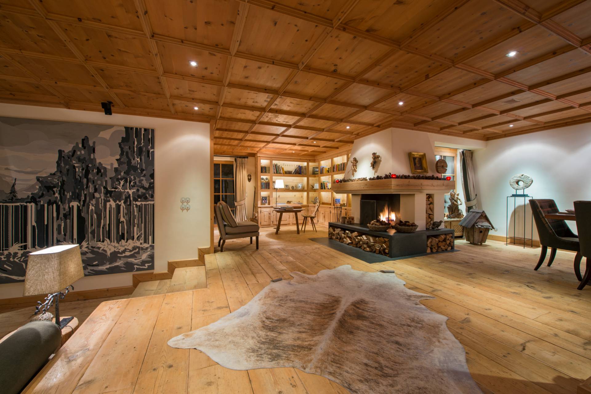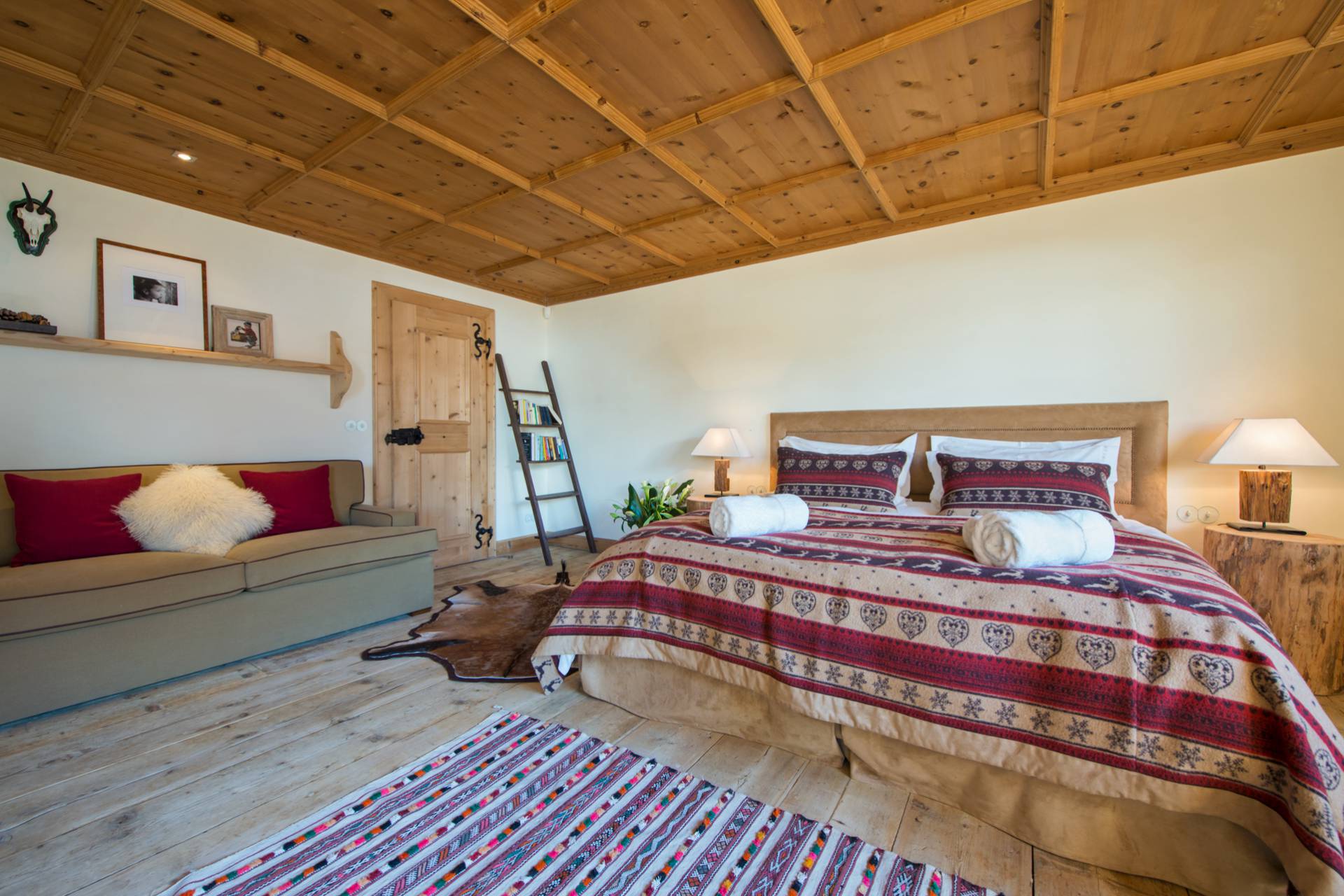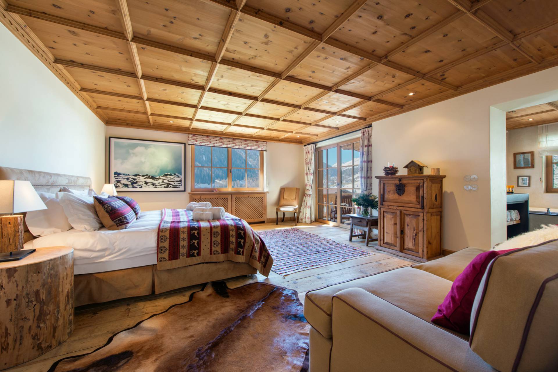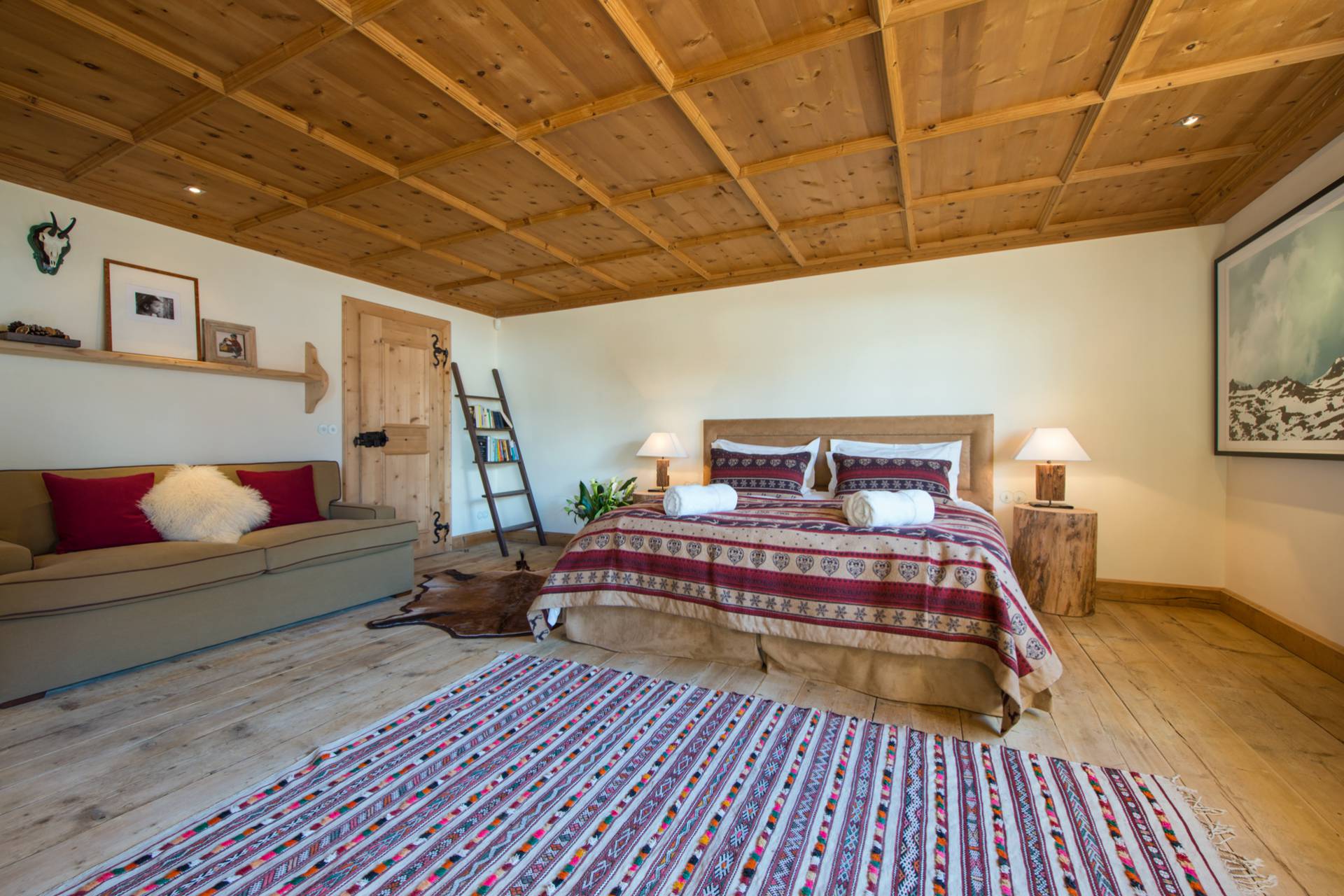 Proche d’un travail d’orfèvrerie, les portes sont issues d’un bois de chêne datant de 300 ans d’âge. Les différentes œuvres d’art contemporaines, accrochées sur les murs du chalet, accentuent son charme et sa modernité. Vous pourrez profiter, au même étage, d’un grand dressing et d’une cuisine. Sur toute la partie ouest du chalet, le balcon baigne les lieux de lumière.