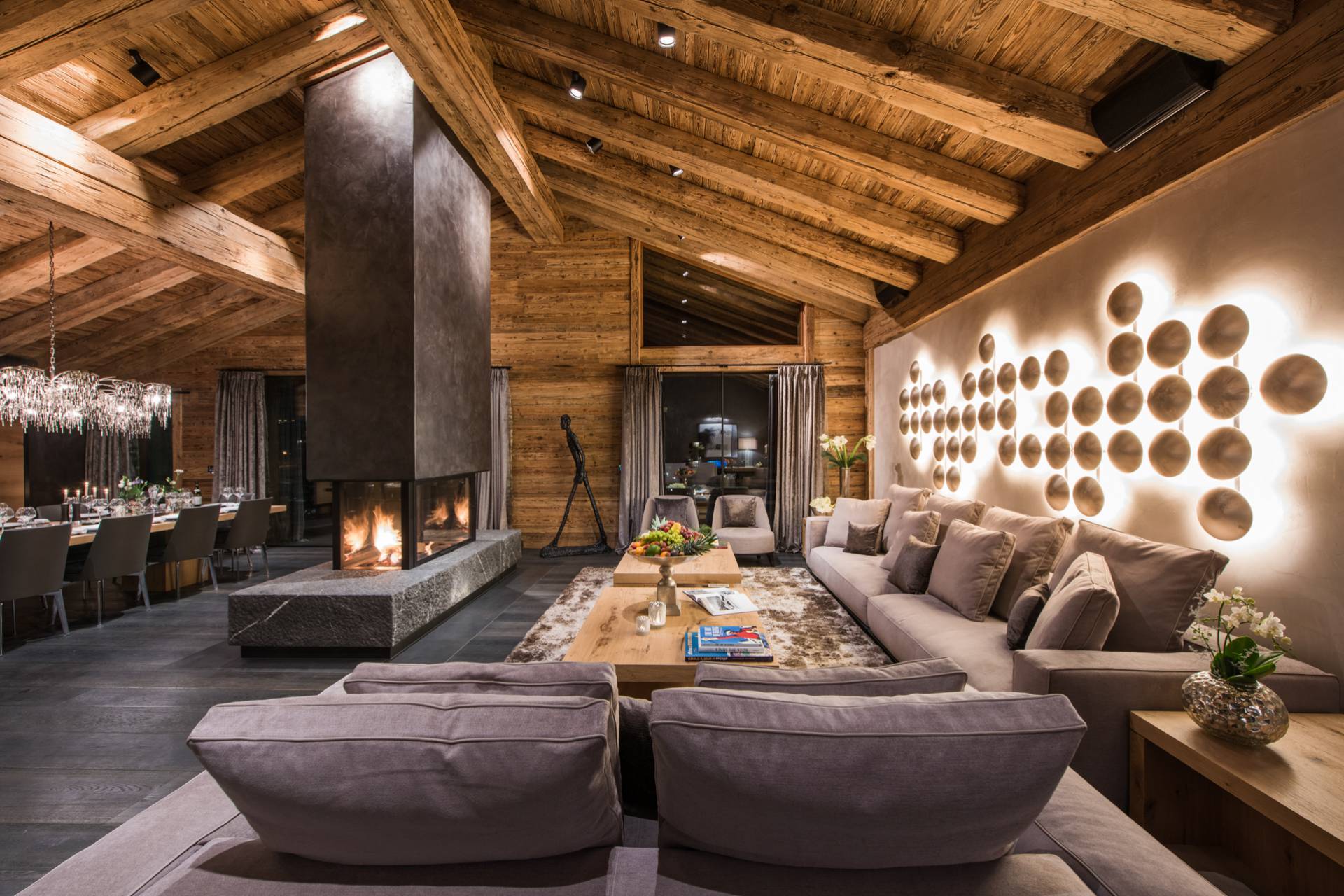 Au dernier étage, vous pourrez admirer la vue époustouflante depuis les vastes canapés du salon, séparé de la salle à manger par une superbe cheminée centrale. Les meubles ont été choisis pour créer une atmosphère élégante et sophistiquée, s'accordant à merveille avec la magnifique charpente traditionnelle. Une cuisine ouverte est mise à votre disposition et complète ainsi la cuisine professionnelle située au rez-de-chaussée.