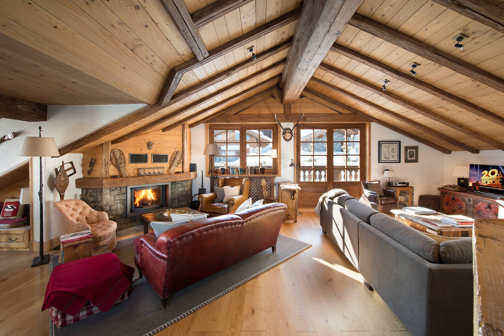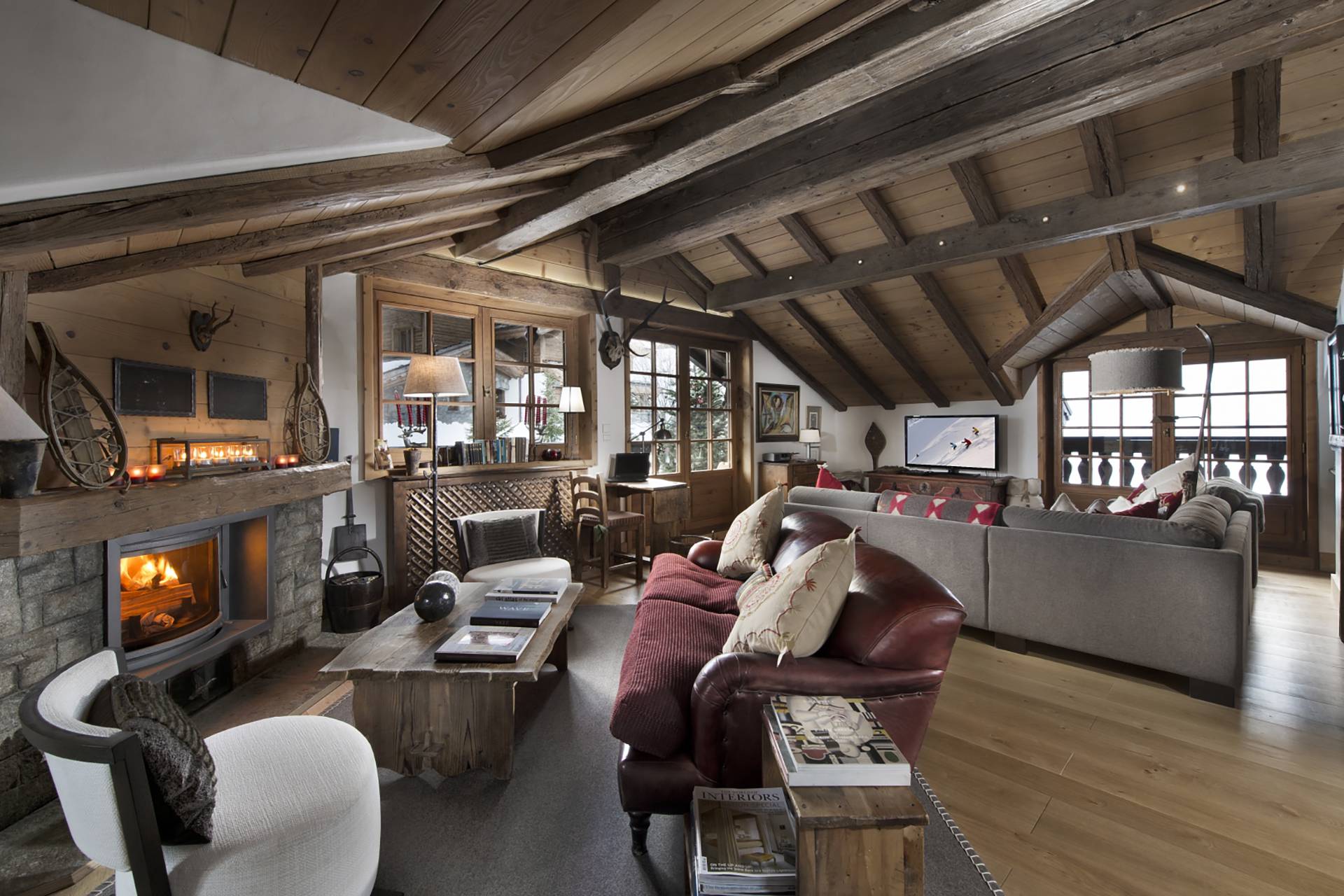Le grand salon convivial semble parfait pour rassembler toute la famille autour d’un bon feu de cheminée. Les canapés de cuir rouge et le mobilier alpin donnent envie de se blottir au coin du feu.
