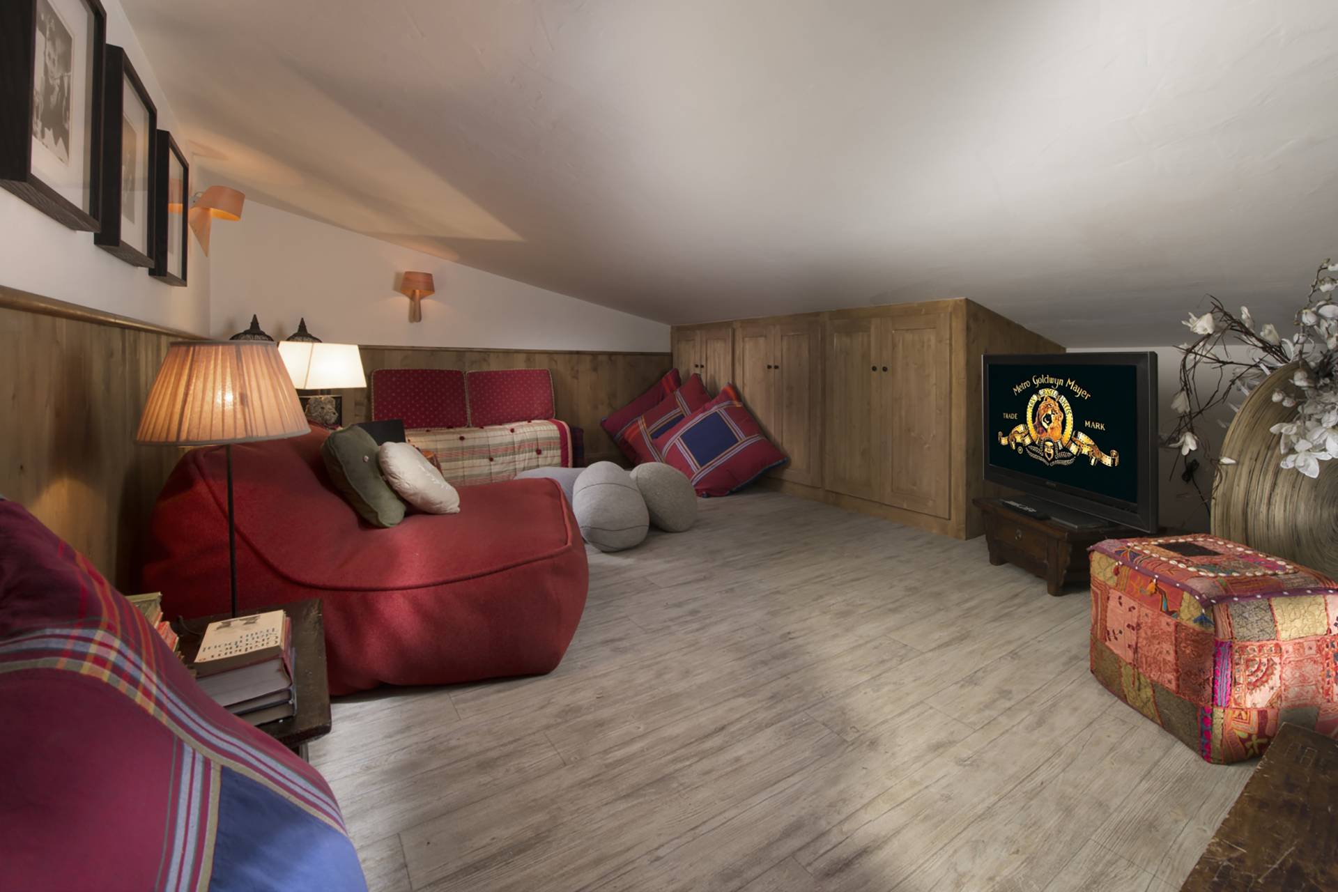 Ce chalet bénéficie d’un étage privé et spacieux correspondant à une « Pièce familiale » : un large salon s’offre à vous, avec plusieurs canapés et une chambre dans le fond de la pièce. Il s’y trouve 2 lits superposés dissimulés derrière des rideaux. Cette pièce familiale dispose de sa propre salle de douche ainsi que d’un Sauna. On image facilement installer les enfants dans cette chambre, pour qu’ils puissent y jouer tranquillement et en faire leur univers pour les vacances.