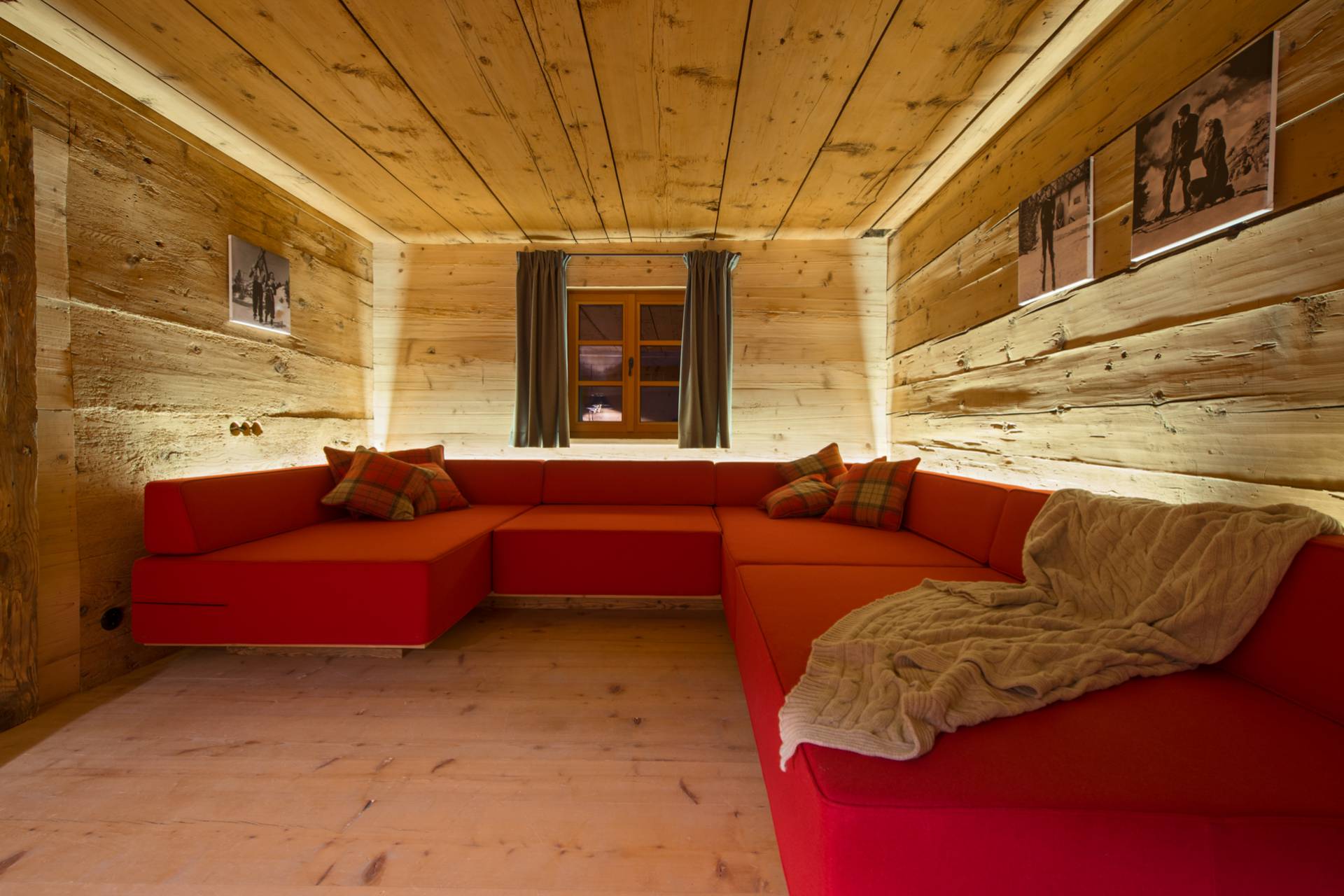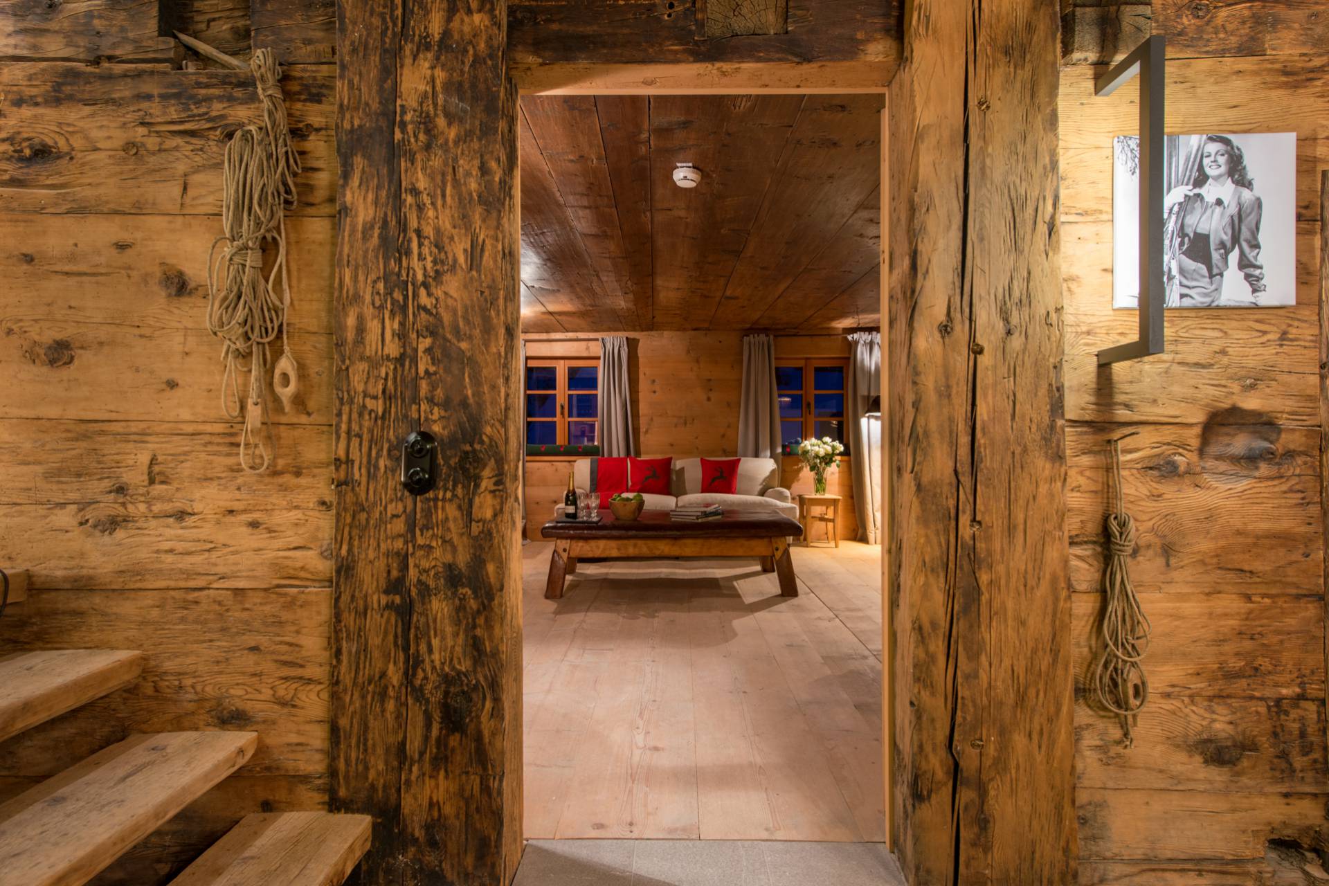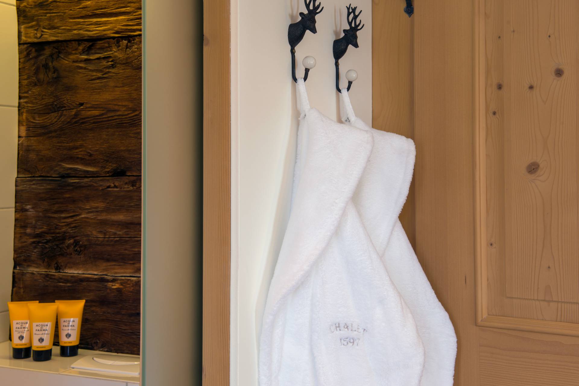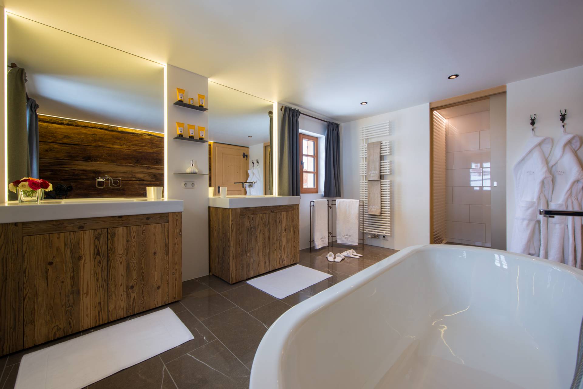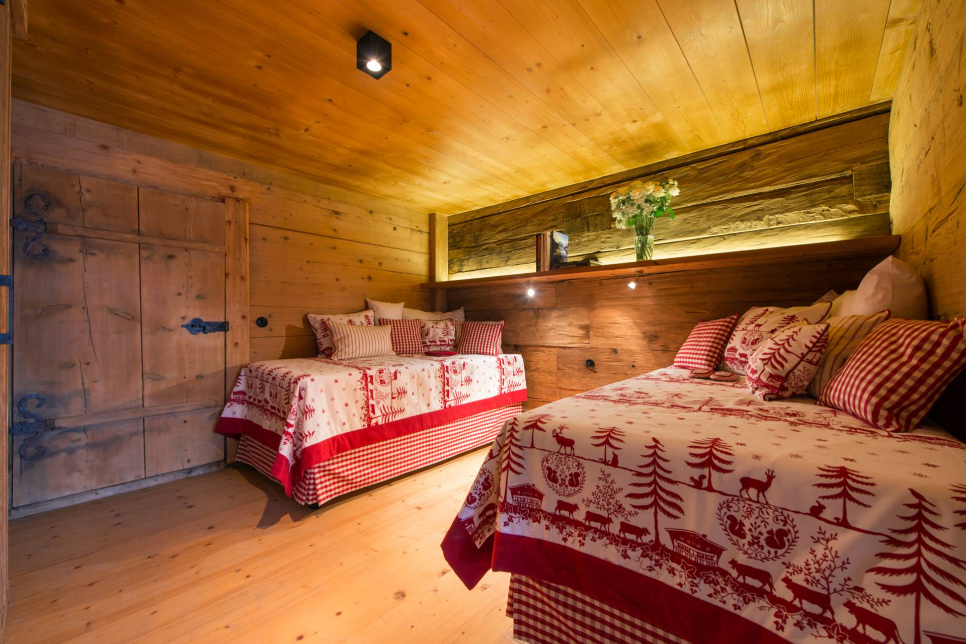 A l’extérieur comme à l’intérieur, l’omniprésence du bois crée une ambiance typique très chaleureuse. Jusqu’à 12 personnes peuvent habiter cinq chambres spacieuses, parfaitement aménagées pour préserver le confort de chacun, dans un décor authentique et raffiné. Le premier étage est ainsi dédié aux couchages et offre notamment une suite parentale, ensemble privatisable avec coin salon, ainsi qu’une chambre pour enfants au style rustique et charmant : couvre-lits et coussins rouges et blancs brodés de sapins et de rennes. Dans les salles de bain attenantes aux chambres, le bois brut est utilisé avec finesse et sobriété pour apporter une véritable touche de modernité. L’ambiance pittoresque de ce chalet autrichien s’accorde à ravir avec le luxe très contemporain.