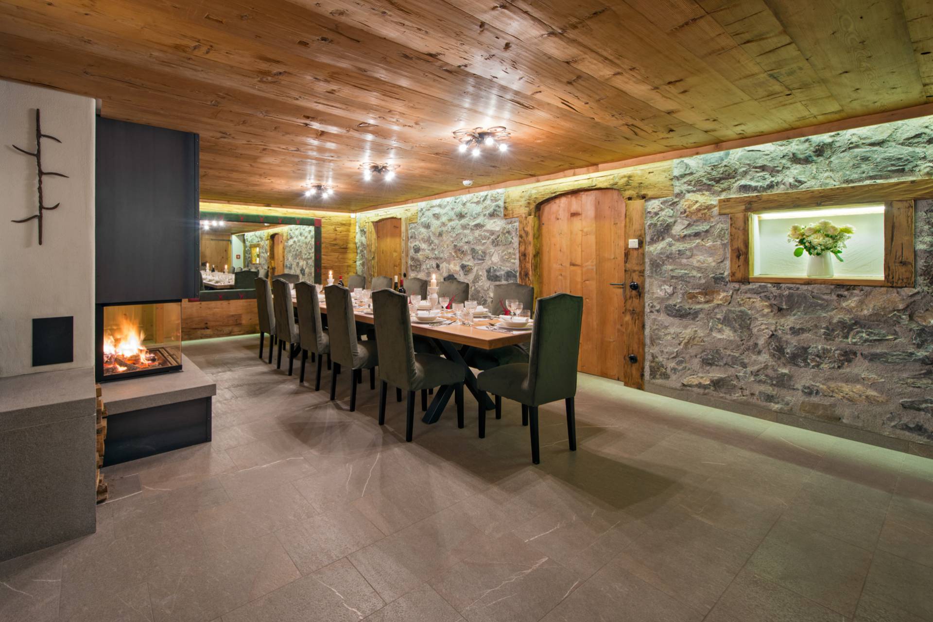 L’étage principal, au rez-de-chaussée, est conçu pour partager des moments de convivialité et de détente. La pièce à vivre aux murs lambrissés et de pierres apparentes se divise en une belle salle à manger, réchauffée par un poêle tyrolien traditionnel, et un grand salon, doublé d’un espace « Home Cinéma » pour profiter de moments en famille après de longues journées en montagne.