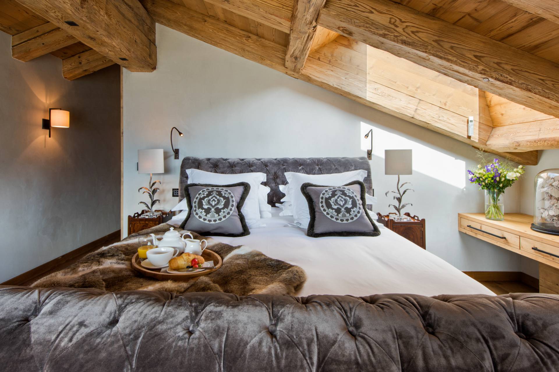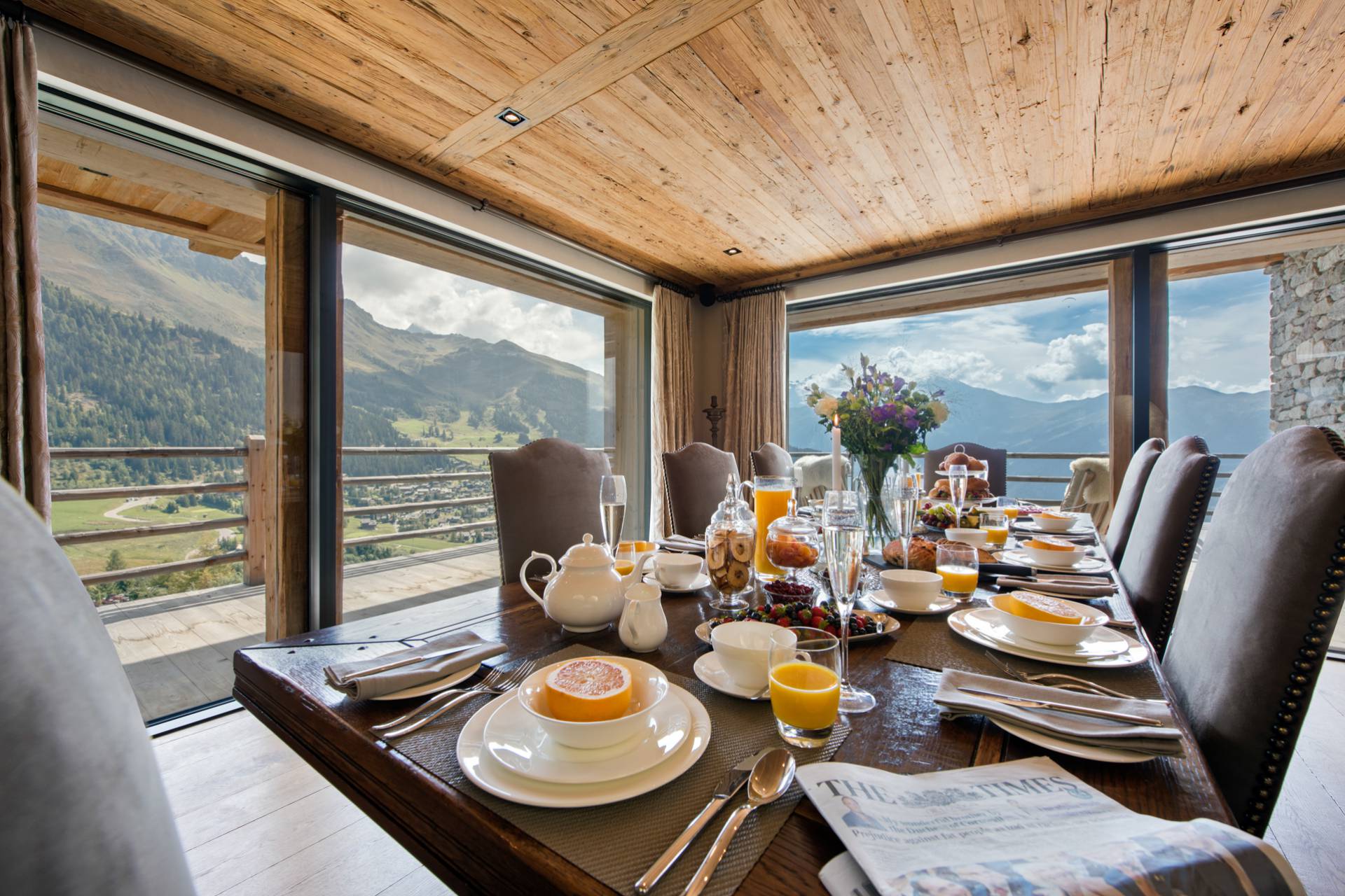 Depuis l’entrée au décor classique, un bel escalier en fer forgé vous conduit au 2ème étage, où le salon, baigné par la lumière naturelle, impressionne par sa vue panoramique sur les montagnes et sa majestueuse cheminée ancienne en pierre calcaire. Vous vous y réunirez dans un mobilier confortable, aux tons clairs, créant une atmosphère feutrée et raffinée, enveloppante et douce. La salle à manger accueillera quant à elle vos réceptions et la cuisine séparée permettra à l’équipe du personnel de vous préparer de délicieux repas. Après une journée sportive, vous aurez aussi le loisir d’admirer le paysage autour d’un verre depuis la terrasse ou le balcon présents à ce niveau.