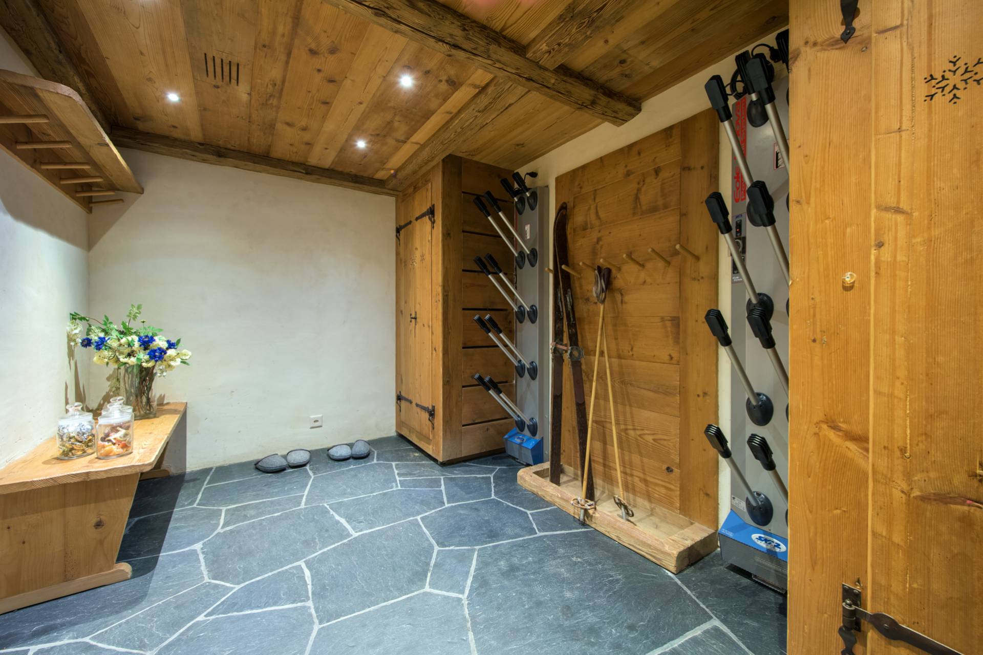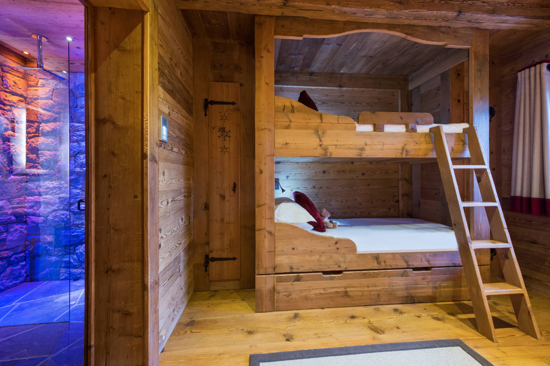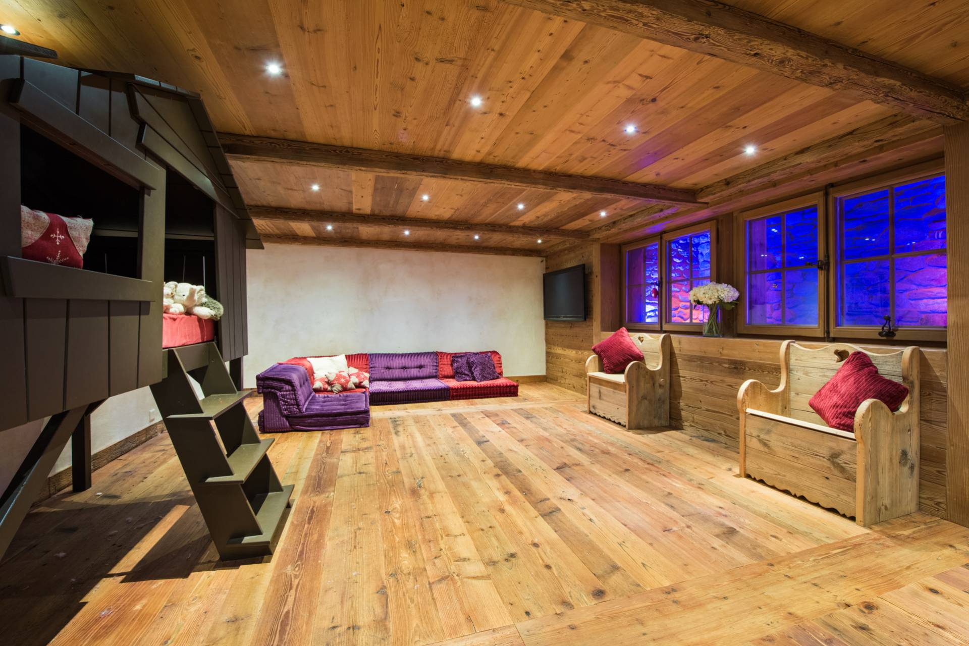L’étage bas abrite quant à lui les espaces fonctionnels : cave, garage, local technique, ainsi qu’un local à skis avec chauffe-chaussures bienvenu les jours d’hiver. L’un des atouts de cette maison est enfin la salle de jeux située à cet étage où les plus jeunes pourront regarder la TV ou s’adonner à une partie de cache-cache dans une petite cabane en mezzanine. La situation du chalet au pied du Jardin des neiges, une piste aménagée pour les skieurs en herbe de l’école de ski suisse, contribue à faire de ce superbe chalet au charme authentique un lieu idéal pour des vacances en famille.