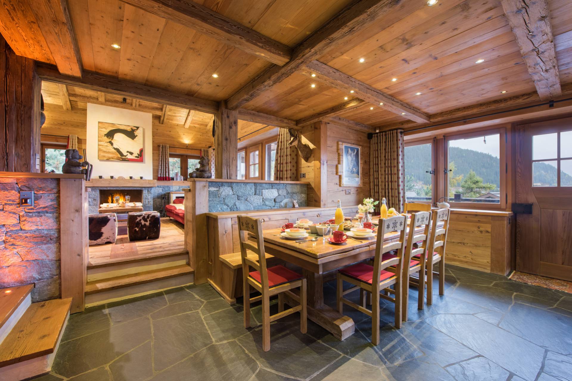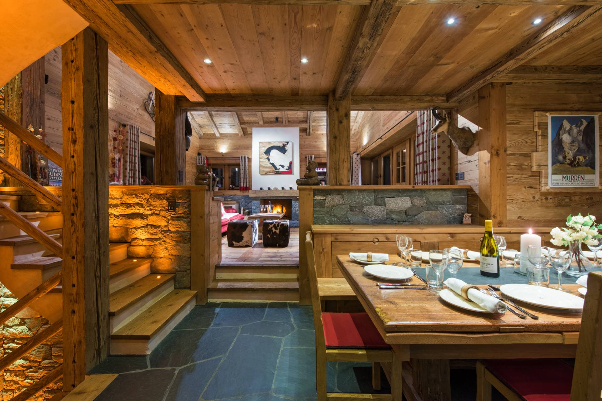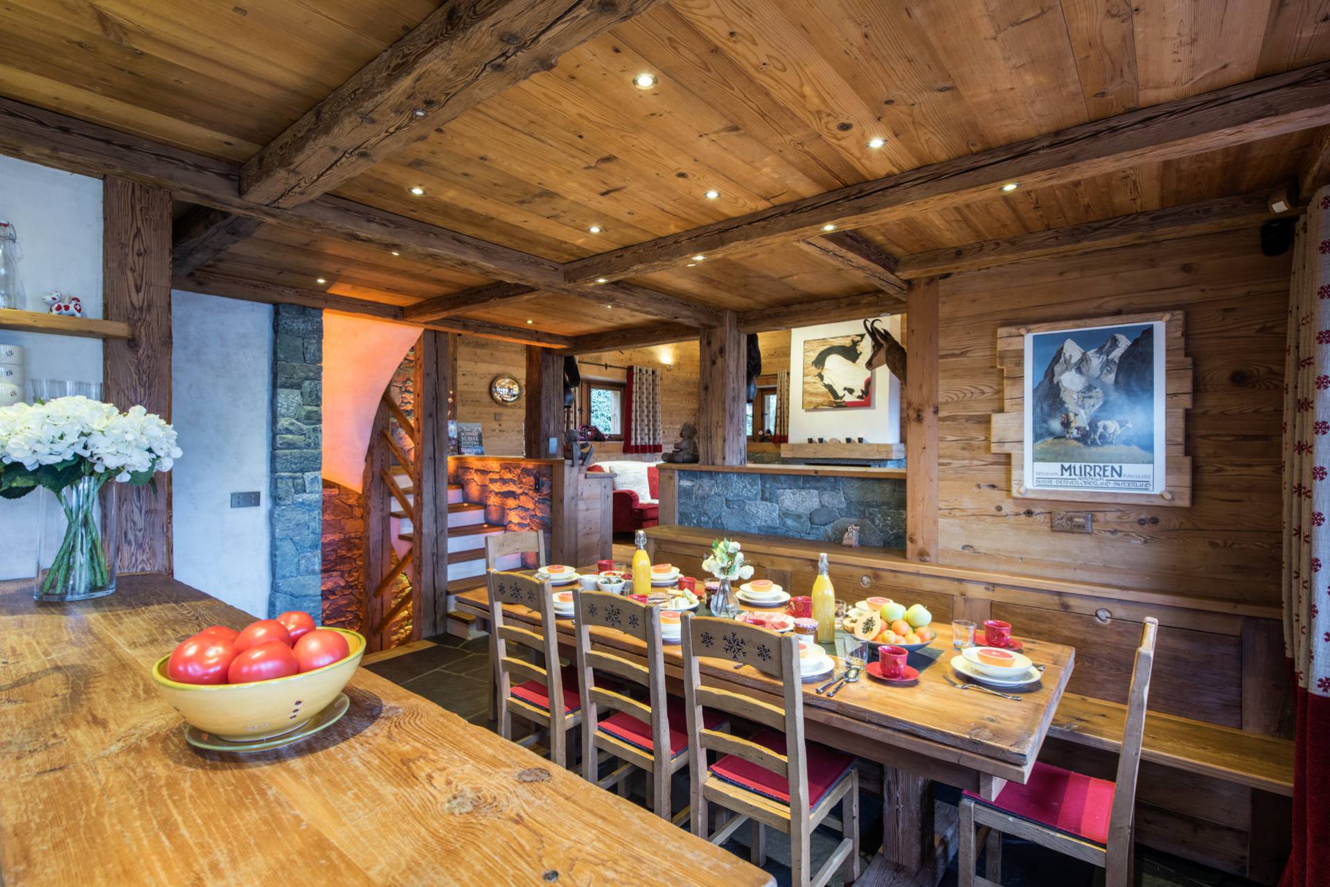A votre arrivée, vous pénétrez par une entrée donnant sur une ravissante salle à manger, avec cuisine ouverte et accès au balcon. Le salon voisin vous permettra de vous réunir autour d’une belle cheminée en pierres naturelles. Vous apprécierez le mobilier en bois aux discrets motifs sculptés, les affiches de voyage vintage, les objets de glisse anciens et les trophées de chasse qui ancrent la demeure dans l’histoire locale.