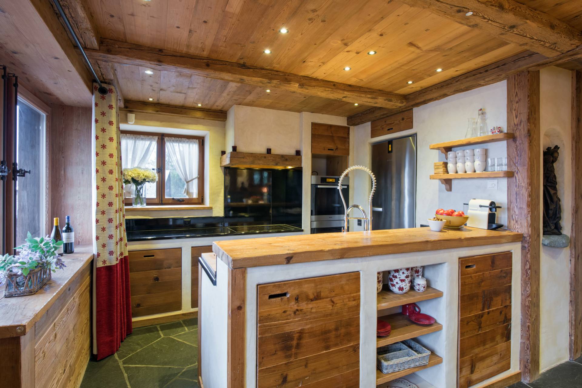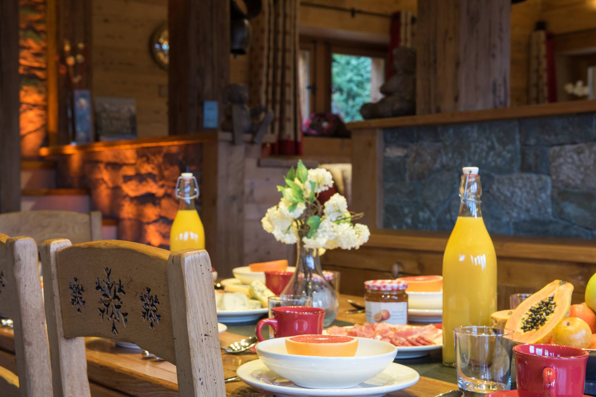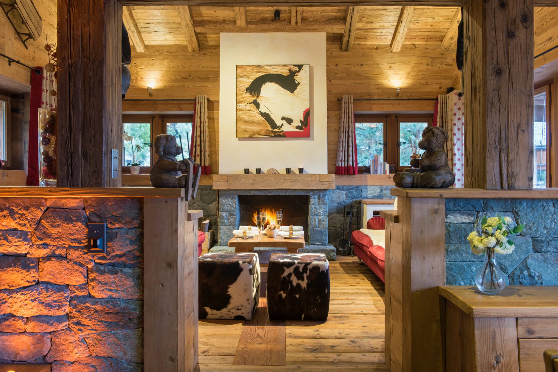 A votre arrivée, vous pénétrez par une entrée donnant sur une ravissante salle à manger, avec cuisine ouverte et accès au balcon. Le salon voisin vous permettra de vous réunir autour d’une belle cheminée en pierres naturelles. Vous apprécierez le mobilier en bois aux discrets motifs sculptés, les affiches de voyage vintage, les objets de glisse anciens et les trophées de chasse qui ancrent la demeure dans l’histoire locale.